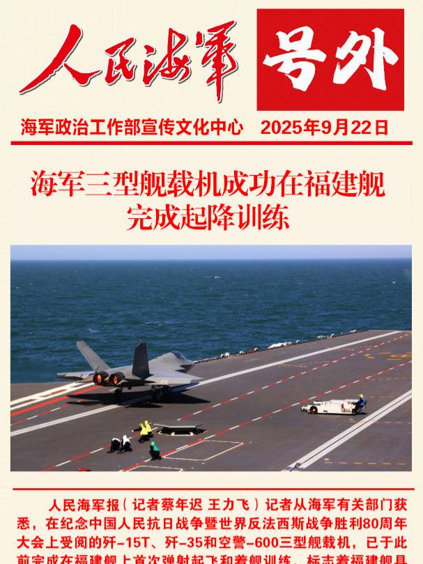 記者從海軍有關(guān)部門獲悉,在紀(jì)念中國人民抗日戰(zhàn)爭暨世界反法西斯戰(zhàn)爭勝利80周年大會上受閱的殲-15T、殲-35和空警-600三型艦載機,已于此前完成在福建艦上首次彈射起飛和著艦訓(xùn)練,標(biāo)志著福建艦具備了電磁彈射和回收能力。這是我國航母發(fā)展歷程中取得的又一次突破,對推進海軍轉(zhuǎn)型建設(shè)具有里程碑意義。