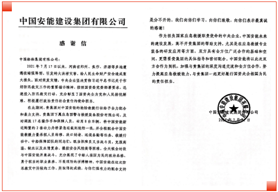 近日,擔負國家應急救援職責使命的中國安能建設集團有限公司發來一封感謝信。