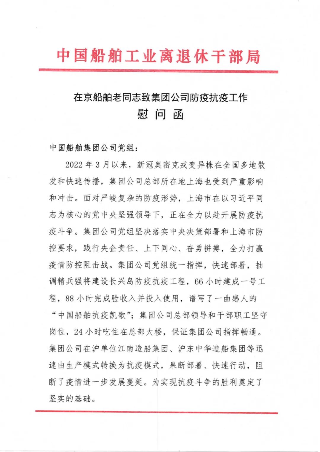 抗疫形勢(shì)嚴(yán)峻復(fù)雜,中國船舶集團(tuán)離退休老領(lǐng)導(dǎo)老同志關(guān)注抗疫、心系集團(tuán),為干部職工加油鼓勁。