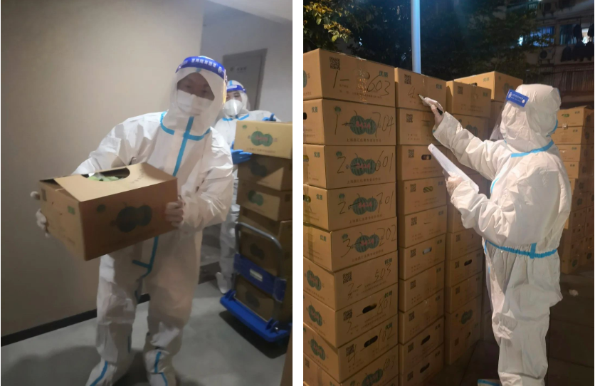 由于防護(hù)服有限,居住在黃浦區(qū)某社區(qū)的集團(tuán)職工中只有鄭珂成了志愿者,只見(jiàn)他時(shí)而忙著卸貨分裝,時(shí)而忙著打包標(biāo)記,7棟樓近400戶(hù)居民共計(jì)幾百公斤的物資,都由他一人完成了分裝和標(biāo)記工作。在他服務(wù)的對(duì)象中,既有身在涉疫樓棟無(wú)法出戶(hù)的同事,也有素未謀面的鄰居。