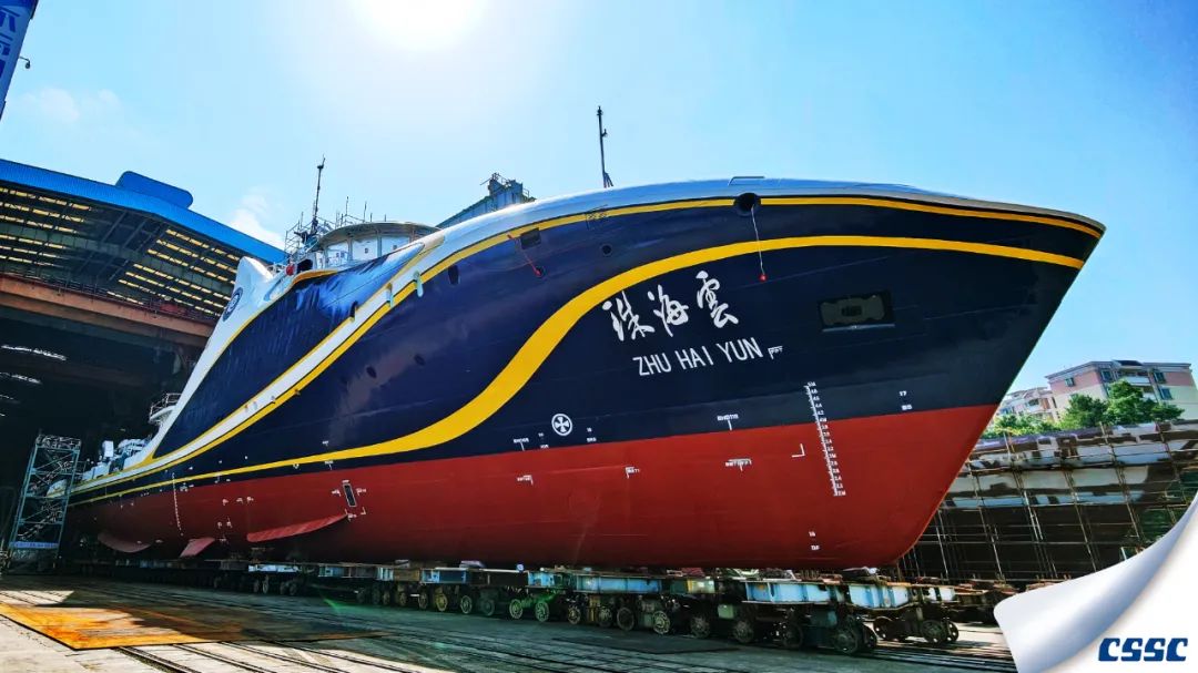 黃埔文沖建造的全球首艘智能型無人系統科考船“珠海云”號下水。這科幻的外表又似一頭巨大的鯨魚躍出海面。