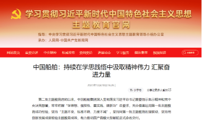 12月18日,學習貫徹習近平新時代中國特色社會主義思想主題教育官網(wǎng)發(fā)布《中國船舶:持續(xù)在學思踐悟中汲取精神偉力 匯聚奮進力量》。中國船舶集團通過繪好“施工圖”、念好“三字經(jīng)”、用好“五字訣”等扎實開展好主題教育,切實以主題教育成果推動集團公司加快建設(shè)世界一流船舶集團。