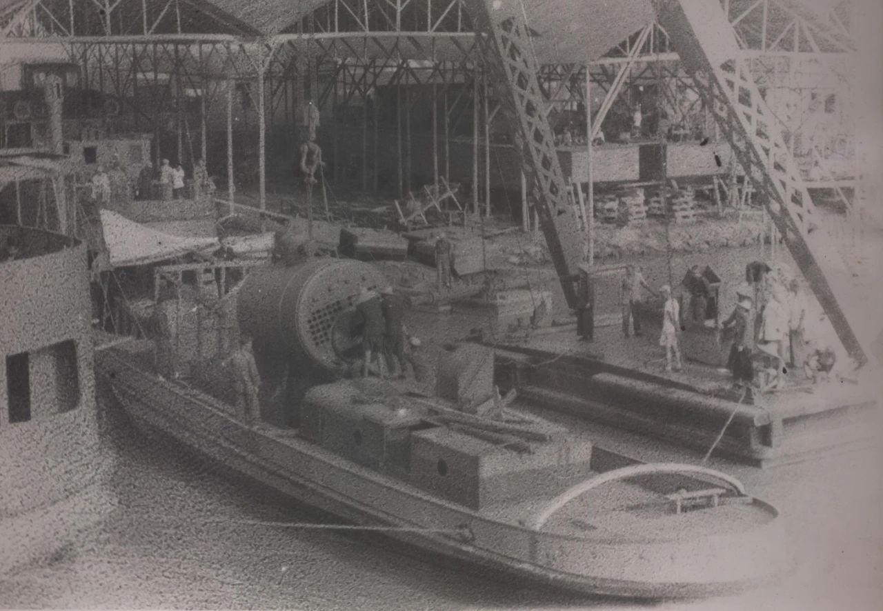 1934年武漢,上世紀(jì)30年代,武昌造船成立之初,工人們以手工作業(yè)“敲敲打打”形式開(kāi)展修造船業(yè)務(wù)。修造的船只大多為100~300噸、鋼肋骨與木殼結(jié)構(gòu),僅有少量是鋼鉚接船體。建造的船只只能在長(zhǎng)江上航行跑跑運(yùn)輸。為了生存和救國(guó),船廠還建造一些農(nóng)用機(jī)械器具、槍支,以輔助民生、支援抗日。