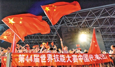 圖為日前在阿拉伯聯(lián)合酋長國舉行的第44屆世界技能大賽開幕式上,人們揮舞著中國國旗歡迎中國代表團(tuán)入場。