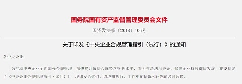 11月2日,國務(wù)院國資委印發(fā)了《中央企業(yè)合規(guī)管理指引(試行)》,推動(dòng)中央企業(yè)全面加強(qiáng)合規(guī)管理,加快提升依法合規(guī)經(jīng)營管理水平,著力打造法治央企,保障企業(yè)持續(xù)健康發(fā)展。