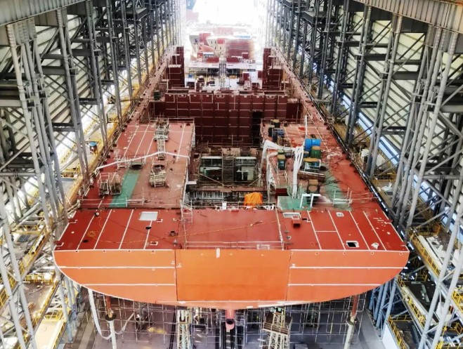 ????黃埔文沖承接的希臘CAPE公司2700TEU集裝箱船3號船,是該公司第一批在室內船臺總組的產品之一。7月1日,該船機艙吊裝成型,標志著室內船臺已具備完整的總組和總裝能力。