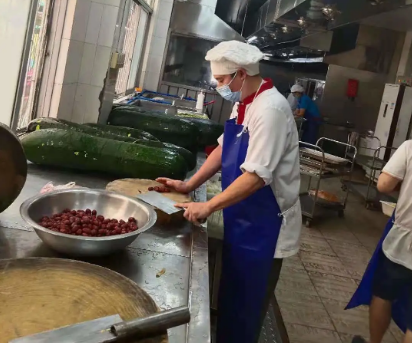 而在技校和養(yǎng)老院的后廚,阮積劍等廚師們同樣已經(jīng)整裝待發(fā)。在社區(qū)封閉初期,飲食服務(wù)部養(yǎng)老院飯?zhí)脝T工由原來(lái)的18人劇減至7人。廚師梁志寬面對(duì)每日約800人的進(jìn)餐人數(shù),迎難而上,轉(zhuǎn)變菜式花樣,合理優(yōu)化膳食,注重營(yíng)養(yǎng)搭配,以嫻熟的廚藝獨(dú)自完成后廚大量工作,保證了菜肴準(zhǔn)時(shí)出品。而廚師、黨員陳兆銘得知飯?zhí)靡蚴芤咔橛绊懚耸謬?yán)重不足,在試航歸來(lái)做完核酸檢測(cè)后立即回到養(yǎng)老院飯?zhí)玫膷徫簧稀榇?,他直接把“家”安在了養(yǎng)老院,每天睡在簡(jiǎn)易折疊床上。