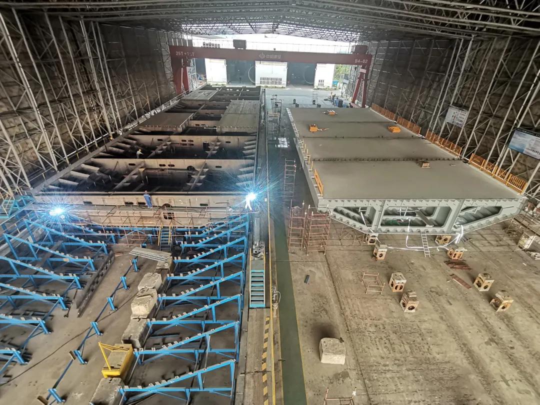 同樣承擔(dān)了深中通道隧道沉管鋼殼制造任務(wù)的中國船舶集團(tuán)旗下廣船國際,近日剛剛完成了E15管節(jié)鋼殼的過駁交付。E16鋼殼計劃在9月底前進(jìn)行聯(lián)合驗收;E17鋼殼則正在進(jìn)行大節(jié)段總組。