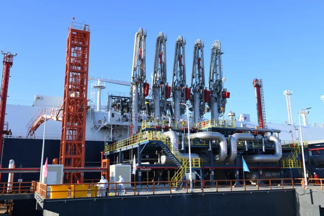 當天中午,隨著“中能連云港”號液化天然氣運輸船順利靠港,即將投用的天津LNG接收站二期碼頭現場熱火朝天。15點30分左右,首套國產卸料臂與國內外四臺卸料臂先后開始船岸對接工作。