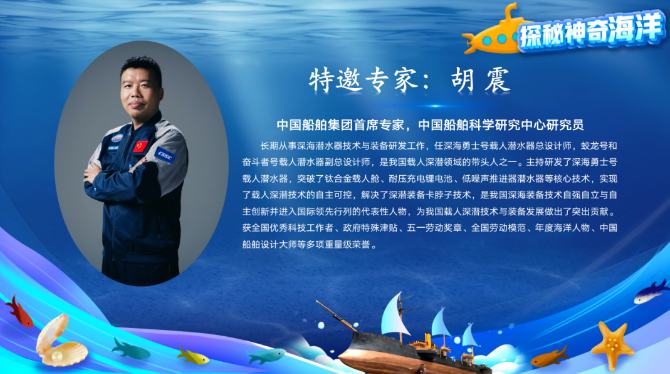 3月22日,由山東省大中小學海洋文化教育研究指導(dǎo)中心、中國海洋大學等單位聯(lián)合主辦的“探秘神奇海洋”云端科普活動的重點板塊之一——“深海探索”直播正式開播。中國船舶集團首席專家、中國船舶集團七〇二所研究員胡震在直播間為廣大觀眾答疑解惑,近6萬名觀眾觀看直播并提出了各類關(guān)于深海的問題。
