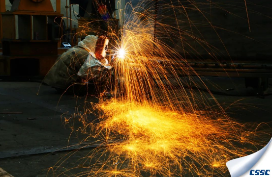 我不知道你是誰,我卻知道你為了誰。中國船柴宜柴公司鋼構廠一名電焊工為了保節點、搶進度,正在加班加點焊接產品。