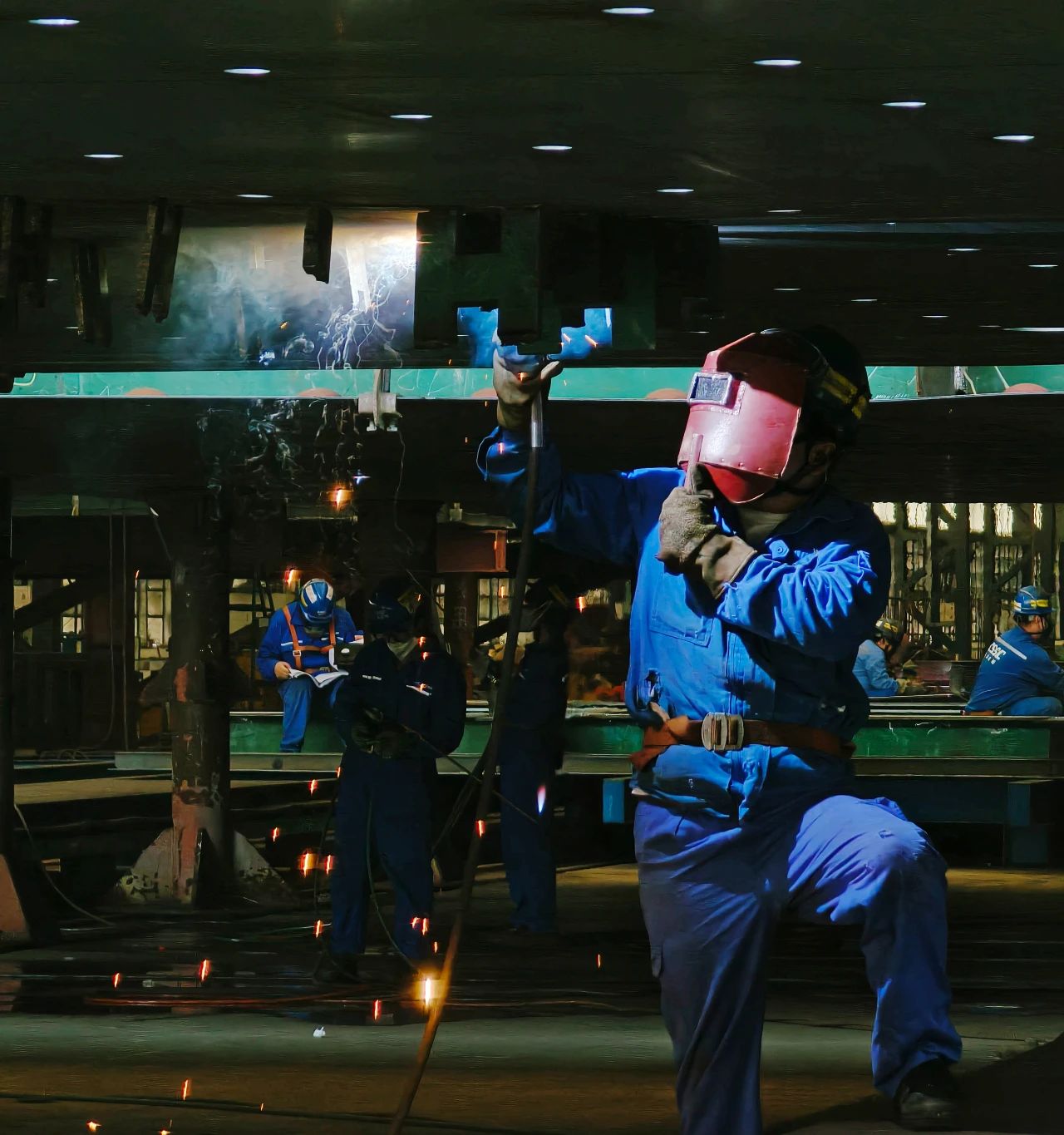 武漢船機——鋼構制造部員工穿著厚厚的防護服進行焊接工作。