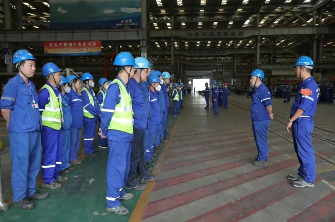 武昌造船、中船澄西、中船物資、中船動力和汾西重工等單位按照“五步法”召開班前會,確認人員狀態(tài)及勞保防護裝備;分享安全案例,剖析隱患;細化工作任務(wù),標注風險,明確應(yīng)急流程;隨機抽查復(fù)述,組員互查要點;全員齊喊安全或精益口號,提振士氣。