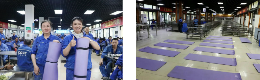中午時(shí)分,走進(jìn)廣船國(guó)際生產(chǎn)指揮樓食堂,十幾臺(tái)空調(diào)已經(jīng)提前開啟,食堂內(nèi)涼爽舒適。據(jù)介紹,該公司已經(jīng)將會(huì)議室、食堂等公共區(qū)域開放給一線員工作為午間的“休憩港灣”,讓一線員工得以安心小憩、恢復(fù)體力。13個(gè)食堂內(nèi),除了不銹鋼凳子、桌子可以供員工躺下休息之外,還為員工準(zhǔn)備了瑜伽墊。