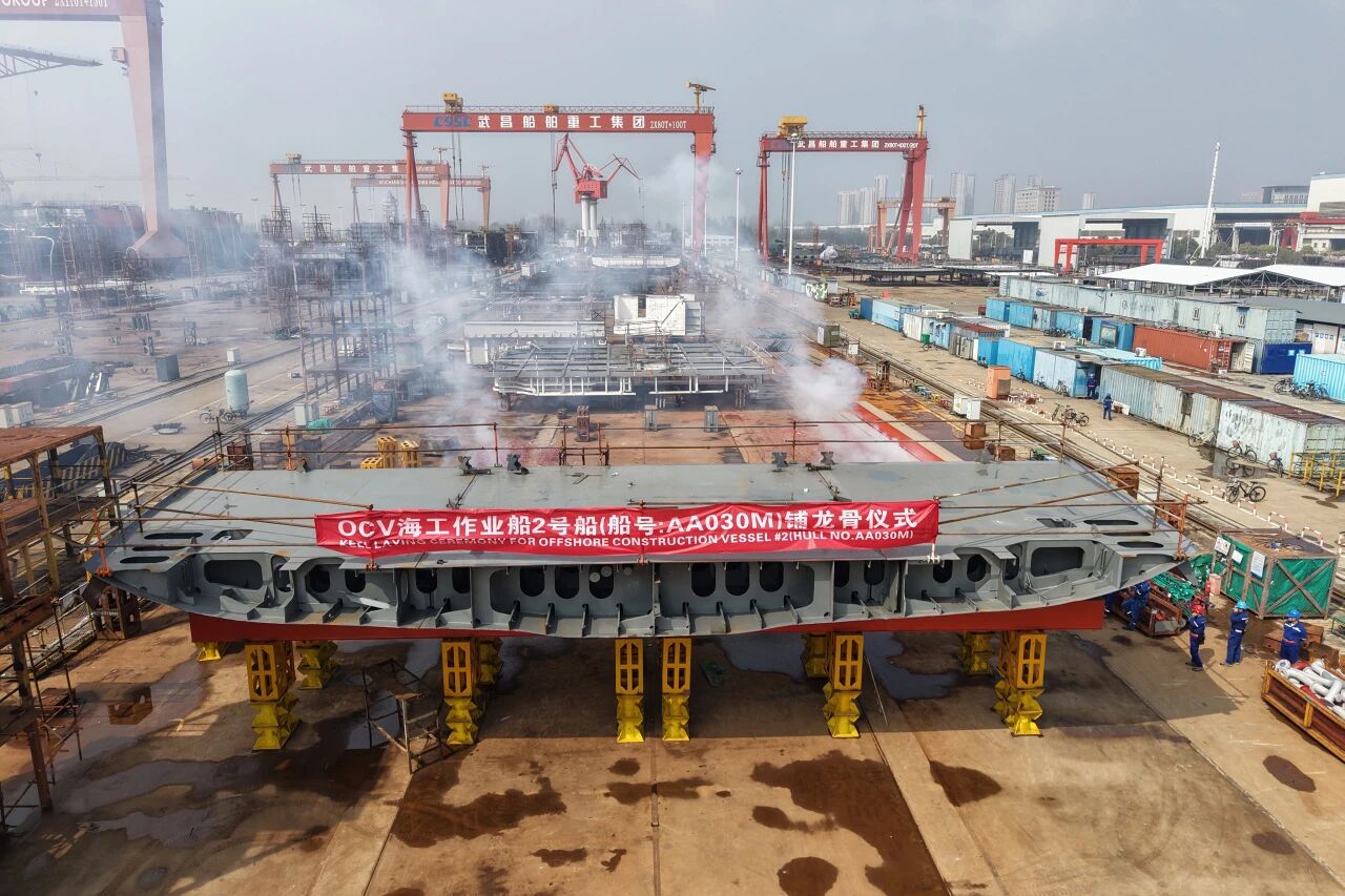 由武昌造船承建的海工作業船2號船順利達成上船臺節點,正式進入船臺連續搭載階段。
