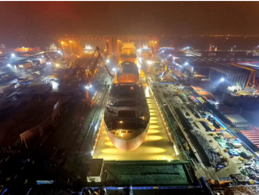 ——第二次改造,2018年10月至2020年6月,再次接長200米,建成后總長達740米。通過中間塢門分別形成前后兩個獨立塢室,以滿足年產1.5艘大型郵輪及3艘VLCC綱領產品要求。