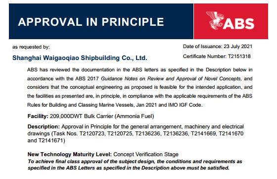 日前,中國船舶集團旗下外高橋造船自主研發(fā)設計的21萬噸氨燃料動力散貨船獲得美國船級社(ABS)頒發(fā)的原則性認可證書(AIP)。作為具有潛力的零碳燃料,氨燃料能滿足更加嚴格的溫室氣體排放要求,是未來脫碳航運業(yè)中最有希望的替代燃料之一。氨燃料動力船型的推出,為航運業(yè)提供一種零碳運輸?shù)沫h(huán)保新方案。