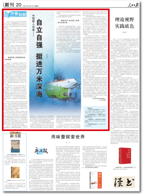 3月2日,人民日?qǐng)?bào) “開(kāi)卷知新” 專(zhuān)欄刊發(fā)“蛟龍?zhí)枴笨傇O(shè)計(jì)師中國(guó)工程院院士中國(guó)船舶集團(tuán)七〇二所研究員徐芑南文章《中國(guó)載人深潛——自立自強(qiáng) 挺進(jìn)萬(wàn)米深海》。