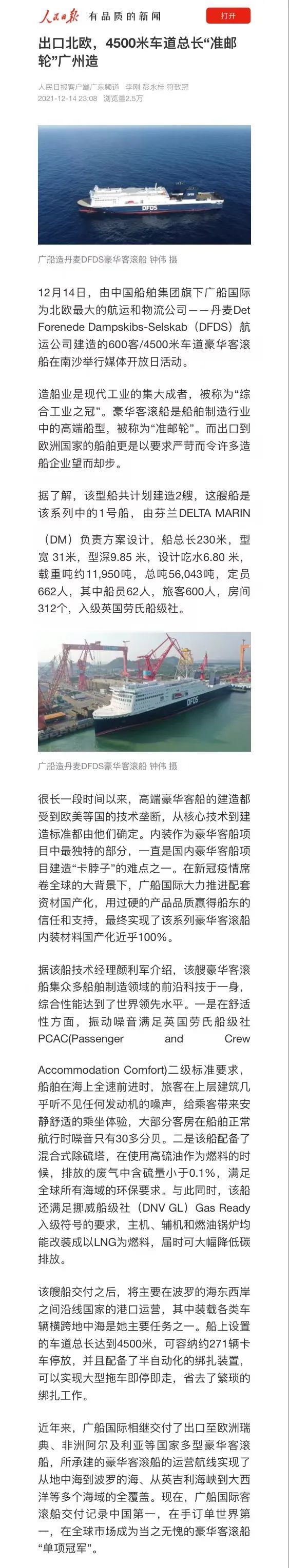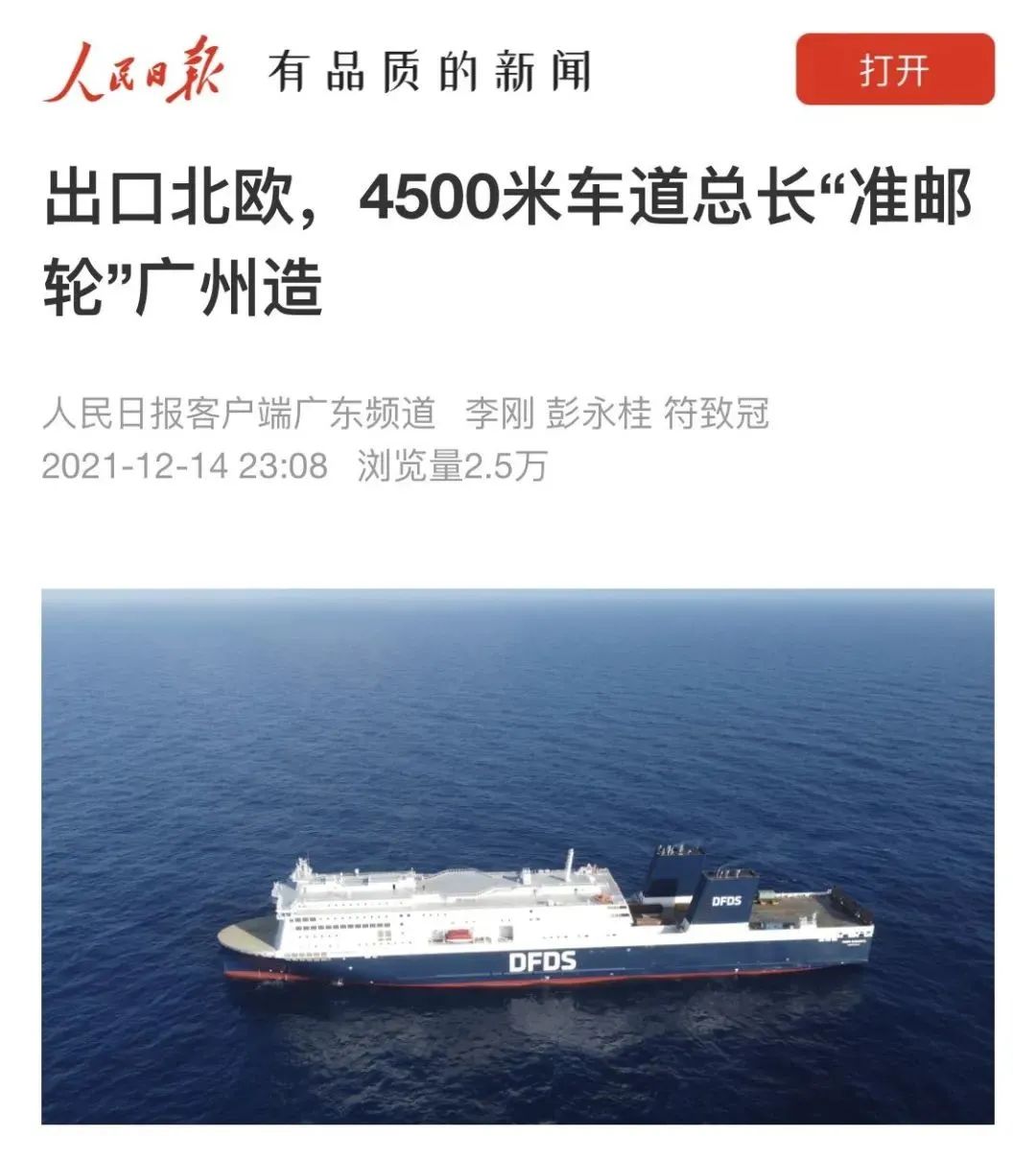 對這艘“準郵輪”的高端船舶,媒體盛贊廣船國際在新冠疫情席卷全球的大背景下,大力推進配套資材國產化,用過硬的產品品質贏得船東的信任和支持,最終實現了該系列豪華客滾船內裝材料國產化近乎100%,是當之無愧的豪華客滾船“單項冠軍”。