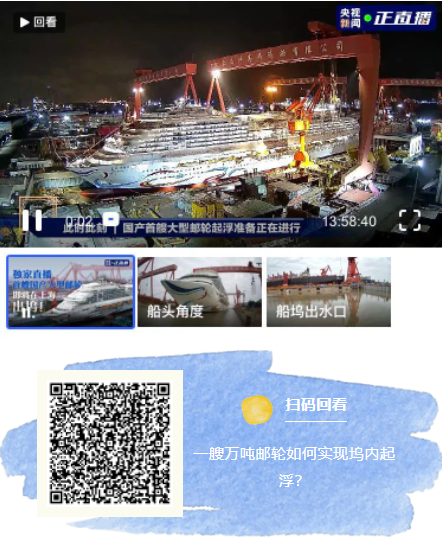 目前,船塢注水已經(jīng)結(jié)束,郵輪已經(jīng)起浮,將相繼實(shí)現(xiàn)起浮、移塢和出塢,您也可以掃描下方圖片中二維碼,一鍵直達(dá)直播現(xiàn)場。