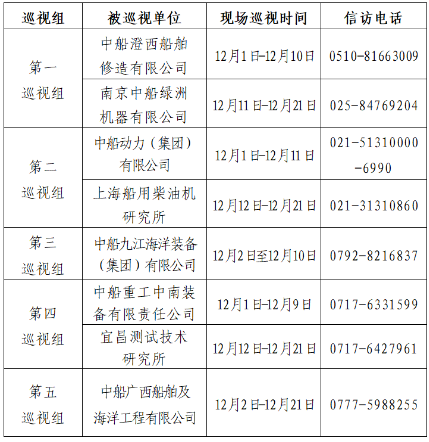 根據(jù)中國船舶集團黨組2022年第二輪巡視工作部署,截至2022年12月2日,中國船舶集團黨組5個巡視組已進駐中船澄西船舶修造有限公司、中船動力(集團)有限公司、中船九江海洋裝備(集團)有限公司、中船重工中南裝備有限責任公司、中船廣西船舶及海洋工程有限公司等單位,開展為期20天左右的巡視“回頭看”。巡視期間,巡視組設置專門值班電話(具體如下表),同時在巡視組工作現(xiàn)場設置聯(lián)系信箱,廣大干部職工可以反映情況。